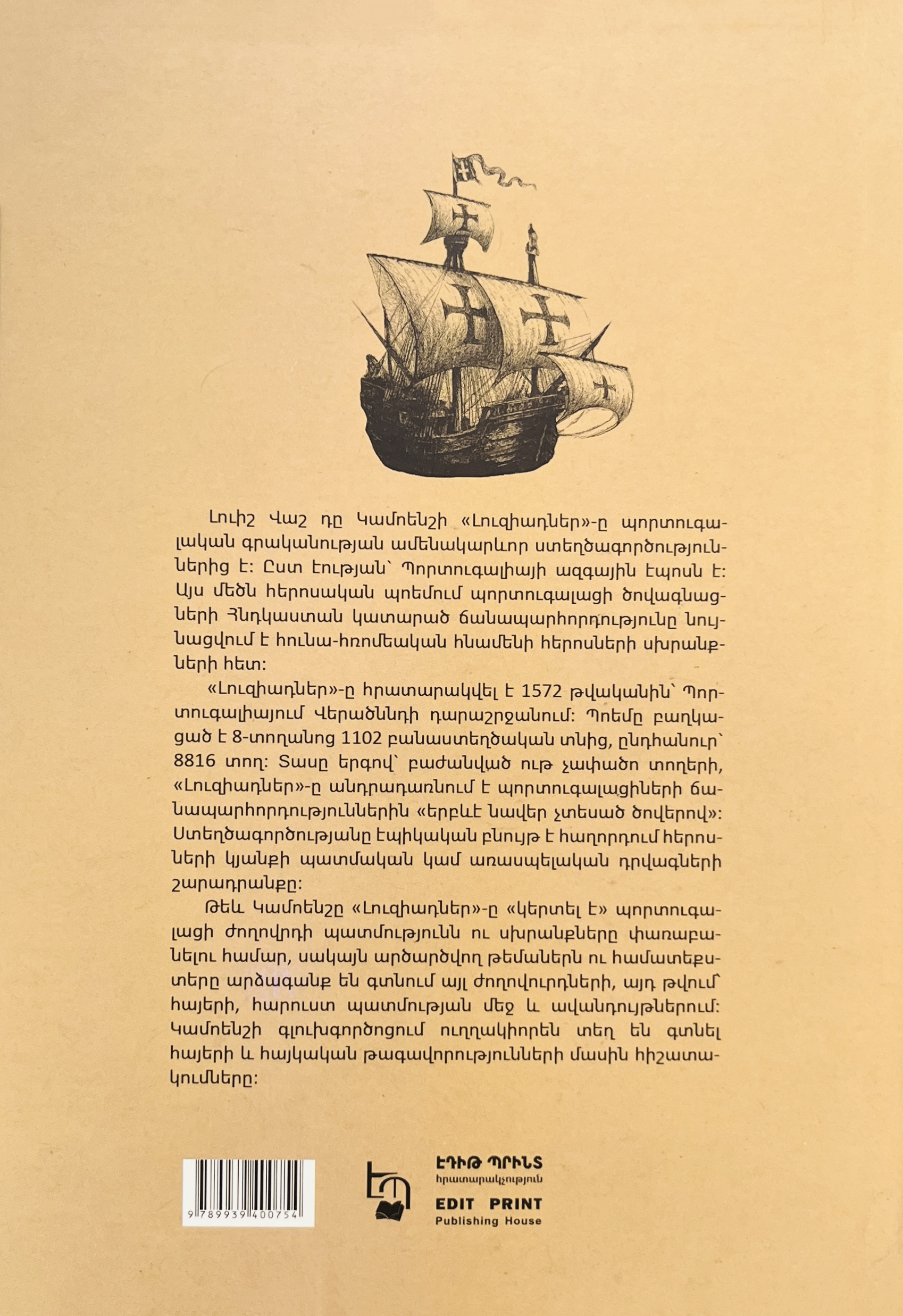 Լուիշ Վաշ դը Կամոենշի «Լուզիադներ»-ը պորտուգալական գրականության ամենակարևոր ստեղծագործություններից է։ Ըստ էության` Պորտուգալիայի ազգային էպոսն է։ Այս մեծն հերոսական պոեմում պորտուգալացի ծովագնացների Հնդկաստան կատարած ճանապարհորդությունը նույնացվում է հունա-հռոմեական հնամենի հերոսների սխրանքների հետ։ «Լուզիադներ»-ը հրատարակվել է 1572 թվականին՝ Պորտուգալիայում Վերածննդի դարաշրջանում։ Պոեմը բաղկացած է 8-տողանոց 1102 բանաստեղծական տնից, ընդհանուր` 8816 տող։...