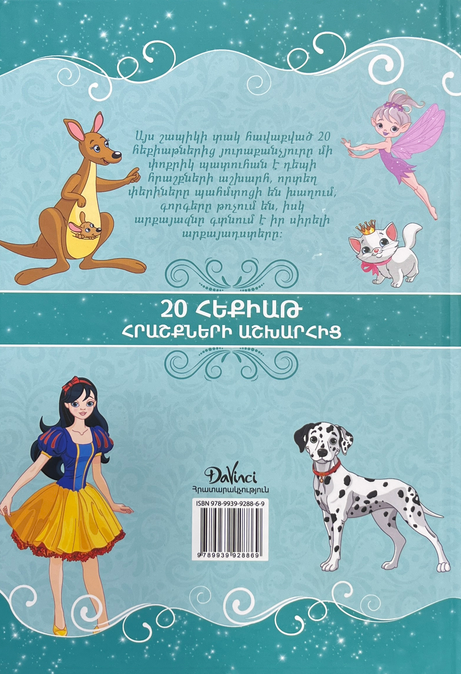 Այս շապիկի տակ հավաքված 20 հեքիաթներից յուրաքանչյուրը մի փոքրիկ պատուհան է դեպի հրաշքների աշխարհ, որտեղ փերիները պահմտոցի են խաղում, գորգերը թռչում են, իսկ արքայազնը գտնում է իր սիրելի արքայադստերը։