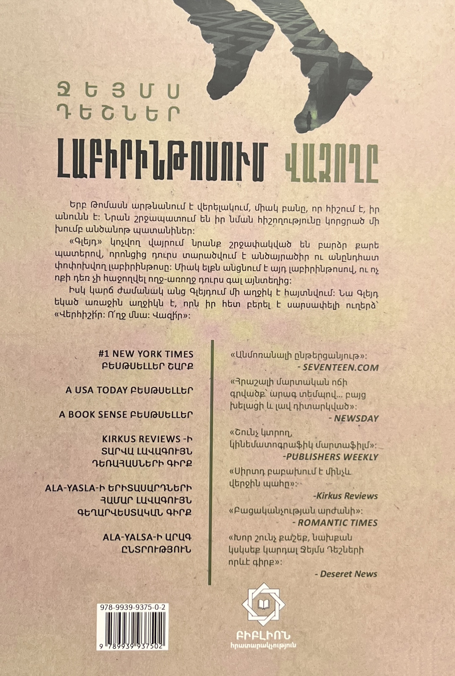 «Լաբիրինթոսում վազողը» շարքը The New York Times օրաթերթի վարկածով ճանաչվել է թիվ 1 բեսթսելլեր: Շարքի առաջին գրքի հերոսը հիշողությունը կորցրած մի պատանի է, որը հայտնվել է հետապոկալիպտիկ աշխարհում և պետք է հաղթահարի մահացու փորձություններ՝ լաբորինթոսից ելքը գտնելու համար: Երբ Թոմասն արթնանում է վերելակում, միակ բանը, որ հիշում է, իր անունն...