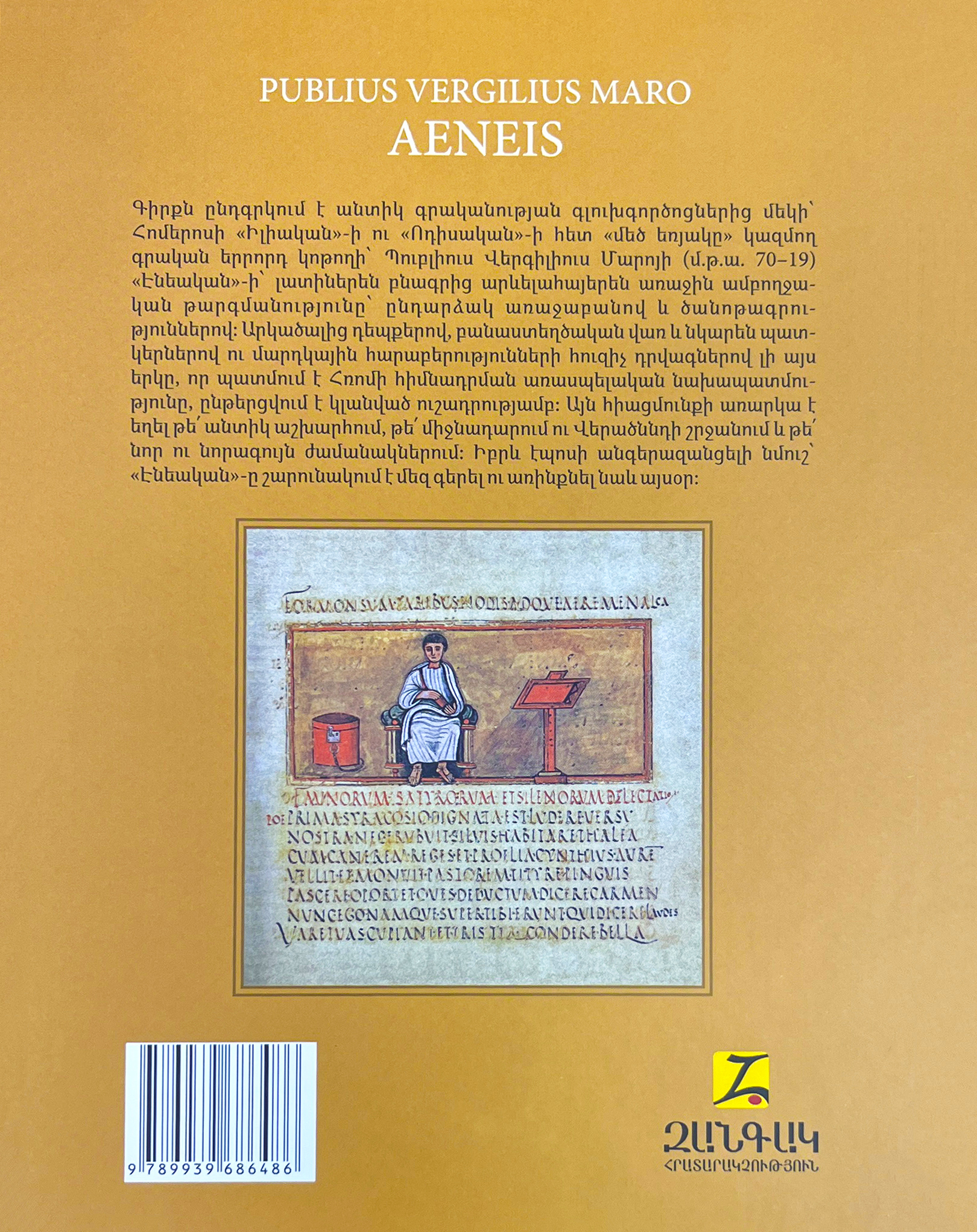 Գիրքն ընդգրկում է անտիկ գրականության գլուխգործոցներից մեկի՝ Հոմերոսի «Իլիական»-ի ու «Ոդիսական»-ի հետ «մեծ եռյակը» կազմող գրական երրորդ կոթողի՝ Պուբլիուս Վերգիլիուս Մարոյի (մ.թ.ա. 70-19) «Էնեական»-ի՝ լատիներեն բնագրից արևելահայերեն առաջին ամբողջական թարգմանությունը՝ ընդարձակ առաջաբանով և ծանոթագրություններով: Արկածալից դեպքերով, բանաստեղծական վառ և նկարեն պատկերներով ու մարդկային հարաբերություննների հուզիչ դրվագներով լի այս երկը, որ...