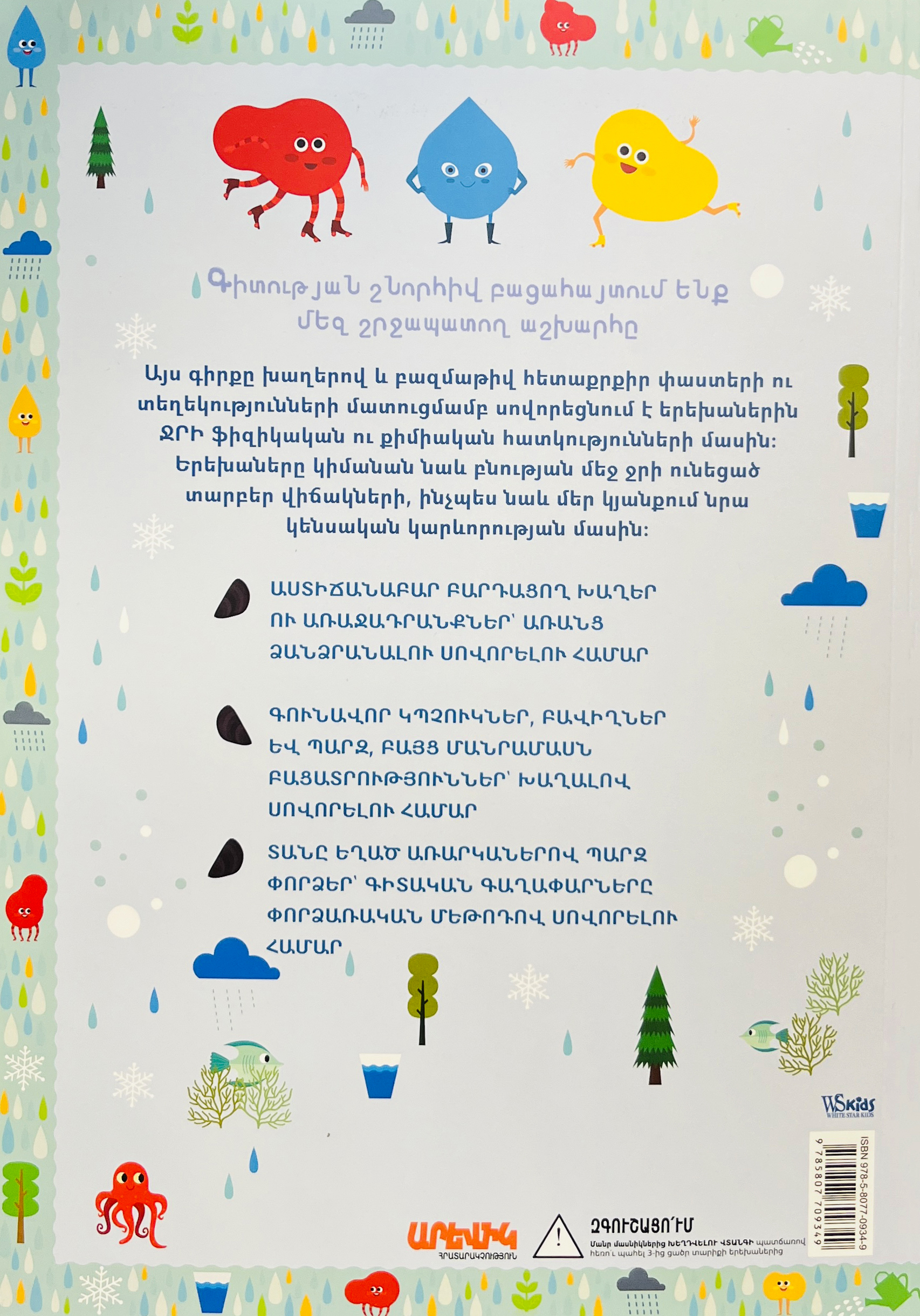 Այս գիրքը խաղերով և բացմաթիվ հետաքրքիր փաստերի ու տեղեկությունների մատուցմամբ սովորեցնում է երեխաներին ՋՐԻ ֆիզիկական ու քիմիական հատկությունների մասին։ Երեխաները կիմանան նաև բնության մեջ ջրի ունեցած տարբեր վիճակների , ինչպես նաև մեր կյանքում նրա կենսական կարևորության մասին։