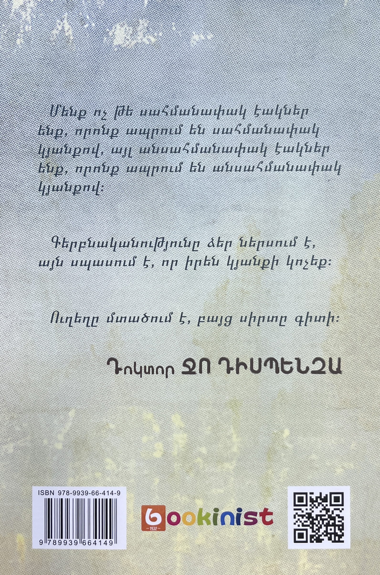 Ջո Դիսպենզա. միջազգային դասախոս, հետազոտող, խորհրդատու, բազմաթիվ բեսթսելերների հեղինակ, մանկավարժ։ Դոկտոր Ջո Դիսպենզան ուսումնասիրություններ է արել նեյրոգիտության, էպիգենետիկայի և քվանտային ֆիզիկայի ոլորտներում: Համագործակցելով տարբեր գիտնականների հետ՝ մեդիտացիայի վերաբերյալ լայնածավալ հետազոտություններ իրականացնելու նպատակով, ներառյալ էպիգենետիկ փորձարկումը, ուղեղի քարտեզագրումը էլեկտրաէնցեֆալոգրամներով և անհատական էներգետիկ դաշտի փորձարկումը գազի արտանետումը պատկերող սարքով՝ նա իր գիտելիքներն է օգտագործում՝ օգնելու մարդկանց բուժվել ինչպես սովորական, այնպես էլ քրոնիկ և անգամ մահացու հիվանդություններից: Նրա իսկ համոզմամբ՝ մեզանից յուրաքանչյուրն ունի մեծության և անսահմանափակ կարողությունների ներուժ։ Եվ այս գրքում կտեսնենք, թե ինչպես են սովորական մարդիկ անում արտասովորը՝ դառնալով գերբնական: Այնպես որ, փորձենք բացահայտել մեր կարողություններն ու հմտությունները՝ վայելելու համար անսահման հնարավորություններով լի այս կյանքը: