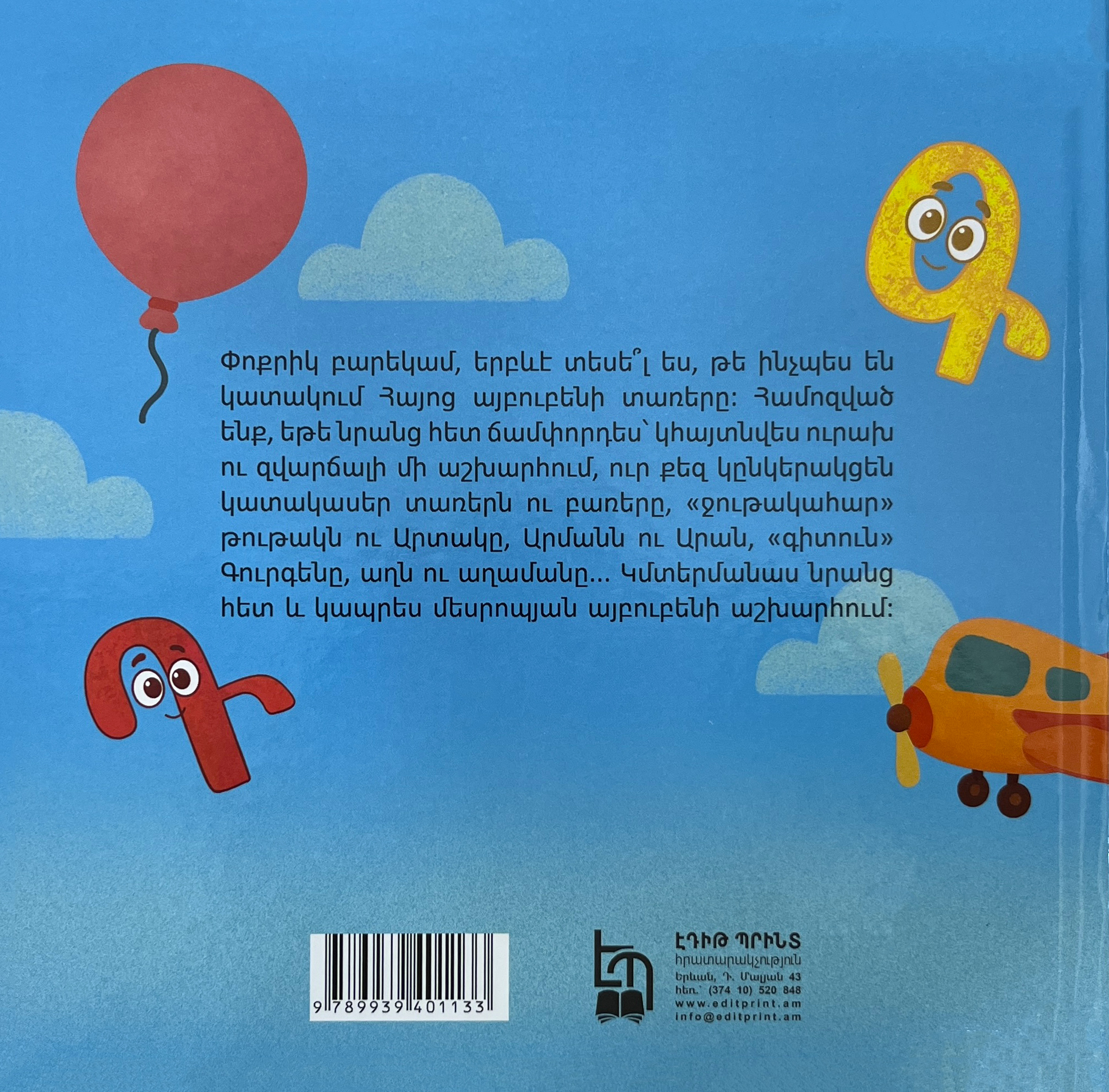 Փոքրիկ բարեկամ, երբևէ տեսե՞լ ես, թե ինչպես են կատակում Հայոց այբուբենի տառերը: Համոզված ենք, եթե նրանց հետ ճամփորդես՝ կհայտնվես ուրախ ու զվարճալի մի աշխարհում, ուր քեզ կընկերակցեն կատակասեր տառերն ու բառերը, «ջութակահար» թութակն ու Արտակը, Արմանն ու Արան, «գիտուն» Գուրգենը, աղն ու աղամանը... Կմտերմանաս նրանց հետ և կապրես մեսրոպյան այբուբենի...