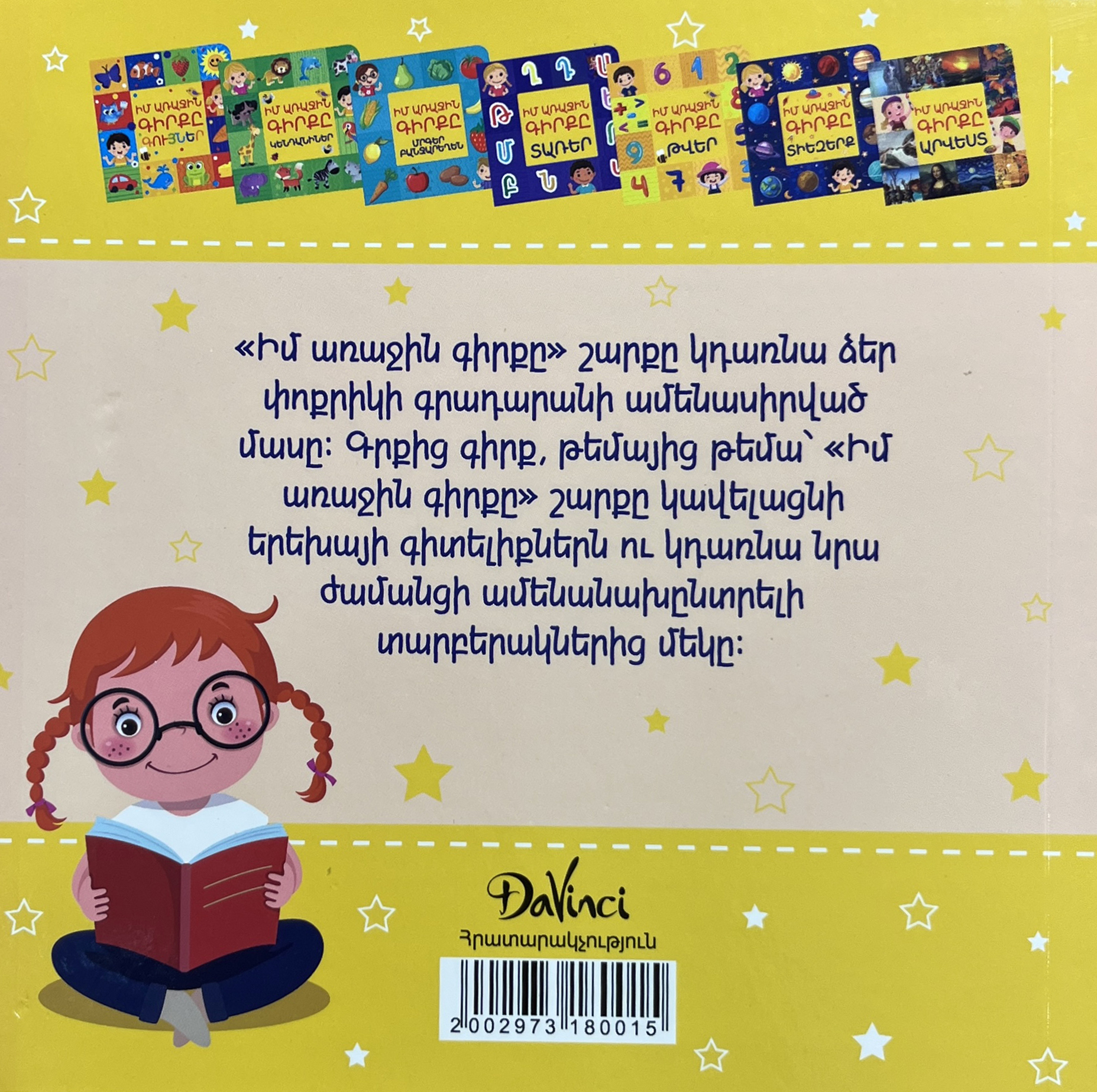 «Իմ առաջին գիրքը» շարքը կդառնա ձեր փոքրիկի գրադարանի ամենասիրված մասը։ Գրքից գիրք, թեմայից թեմա՝ «Իմ առաջին գիրքը» շարքը կավելացնի երեխայի գիտելիքներն ու կդառնա նրա ժամանցի ամենանախընտրելի տարբերակներից մեկը։