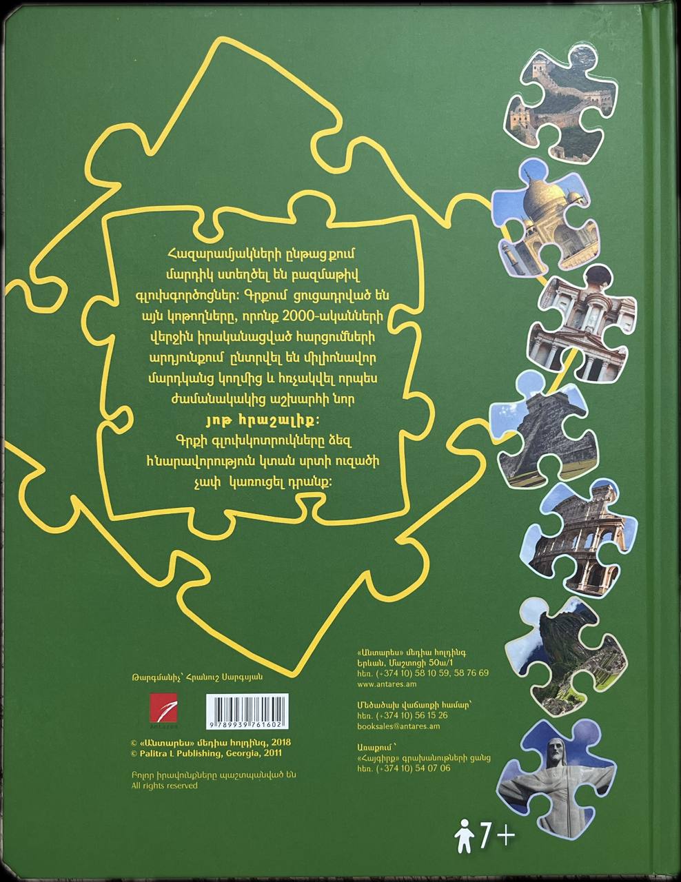 Հազարամյակների ընթացքում մարդիկ ստեղծել են բազմաթիվ գլուխգործոցներ։ Գրքում ցուցադրված են այն կոթողները, որոնք 2000-ականների վերջին իրակացված հարցումների արդյունքում ընտրվել են միլիոնավոր մարդկանց կողմից և հռչակվել որպես ժամանակակից աշխարհի նոր յոթ հրաշալիք։ Գրքի գլուխկոտրուկները Ձեզ հնարավորություն կտան սրտի ուզածի չափ կառուցել դրանք։