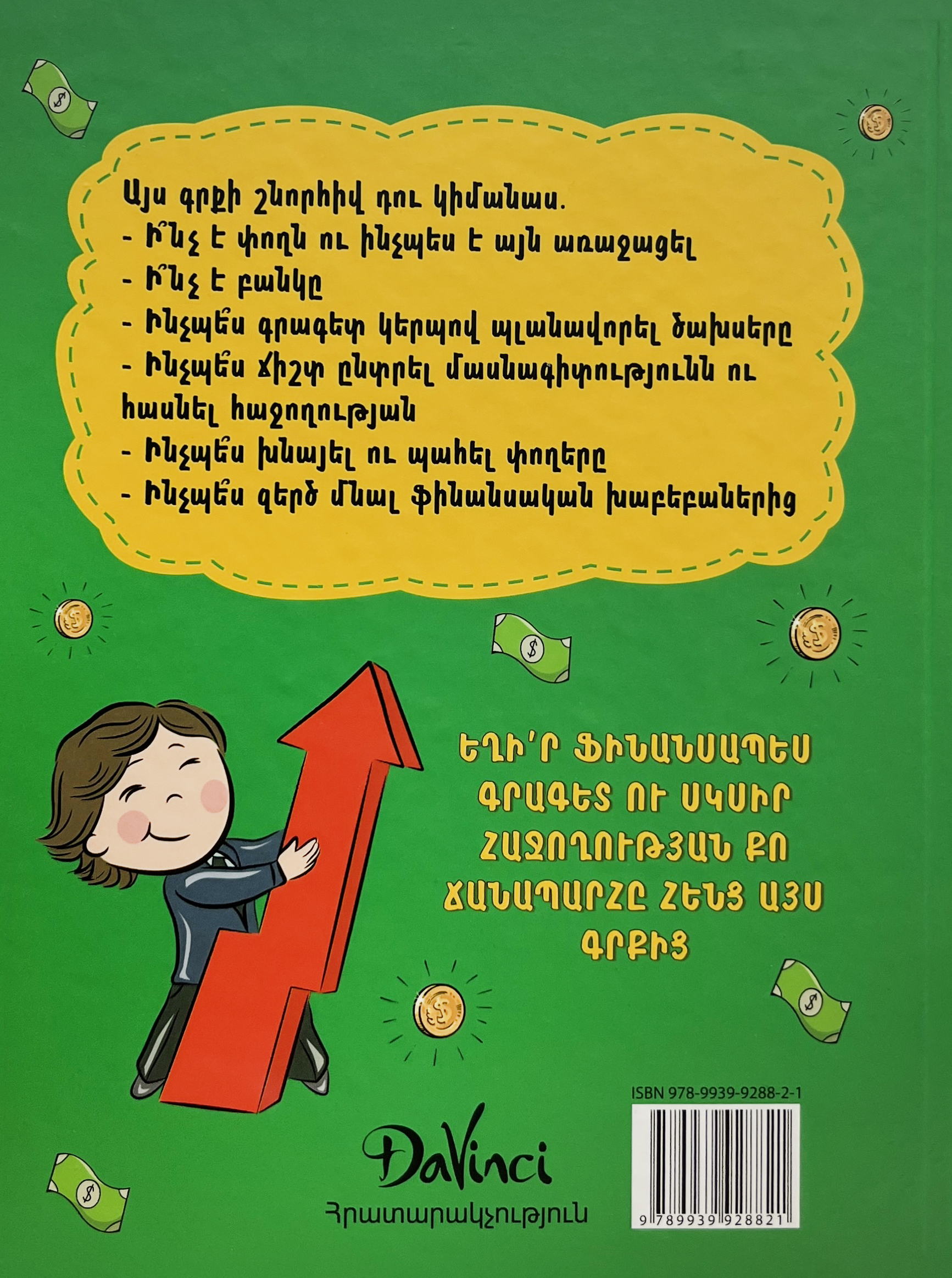 Ինչպես գիտենք 21-րդ դարը ինֆորմացիայի դար է, որտեղ շատ կարևոր է գիտելիքն ու գրագիտությունը։ Ու դա վերաբերվում է բոլոր ոլորտներին։ Բայց մի շատ կարևոր ոլորտ, բաց է մնացել Հայաստանում ու անուշադրության է մատնվել։ Դա ֆինանսական գրագիտությունն է և երեխաների ֆինանսական դաստիարակությունը։ Այս խնդիրը նոր չէ և տարիներ շարունակ այս թեման անտեսվել է։ Ու սա այն թեման է, որի մասին ցավոք չեն խոսում ու չեն սովորեցնում մեր դպրոցներում․․ «Փողն ու բիզնեսը երեխաների համար» գիրքը ստեղծվել է նրա համար, որ այդ բացը որոշ չափով լրացնի։ Գիրքը շատ պարզ ու հասկանալի օրինակներով բացատրում է, թե ինչպես է ընդհանրապես առաջացել փողը, ինչպես տնօրինել այն, ինպես ճիշտ պլանավորել ծախսերը, ինչպես խնայել ու կուտակել, ինչ է իրենից ներկայացնում բանկը և ոնց է աշխատում․․