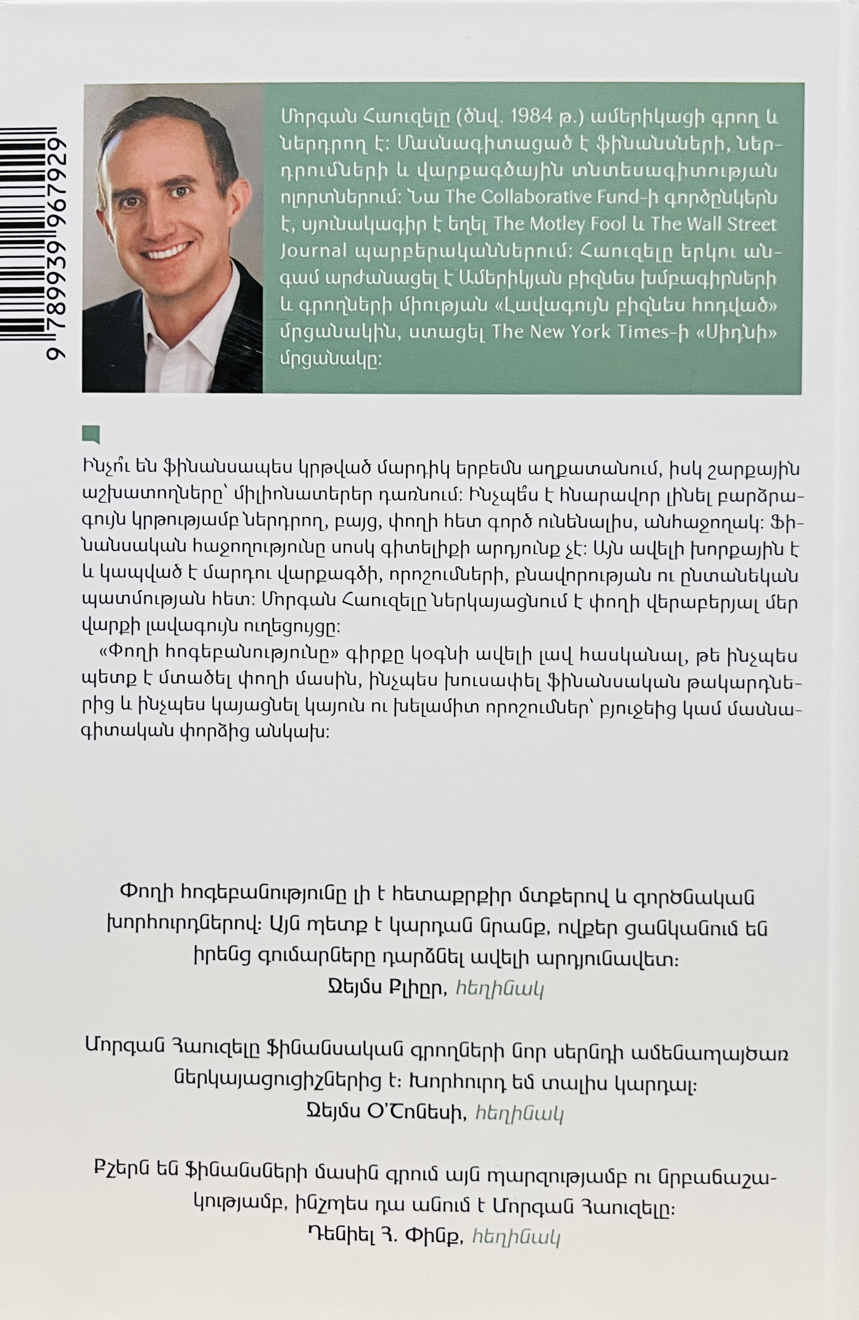 Ինչո՞ւ են ֆինանսապես կրթված մարդիկ երբեմն աղքատանում, իսկ շարքային աշխատողները՝ միլիոնատերեր դառնում։ Ինչպե՞ս է հնարավոր լինել բարձրագույն կրթությամբ ներդրող, բայց, փողի հետ գործ ունենալիս, անհաջողակ։ Ֆինանսական հաջողությունը սոսկ գիտելիքի արդյունք չէ։ Այն ավելի խորքային է և կապված է մարդու վարքագծի, որոշումների, բնավորության ու ընտանեկան պատմության հետ։ Մորգան Հաուզելը ներկայացնում է փողի վերաբերյալ մեր վարքի լավագույն ուղեցույցը։ «Փողի հոգեբանությունը» գիրքը կօգնի ավելի լավ հասկանալ, թե ինչպես պետք է մտածել փողի մասին, ինչպես խուսափել ֆինանսական թակարդներից և ինչպես կայացնել կայուն ու խելամիտ որոշումներ՝ բյուջեից կամ մասնագիտական փորձից անկախ։