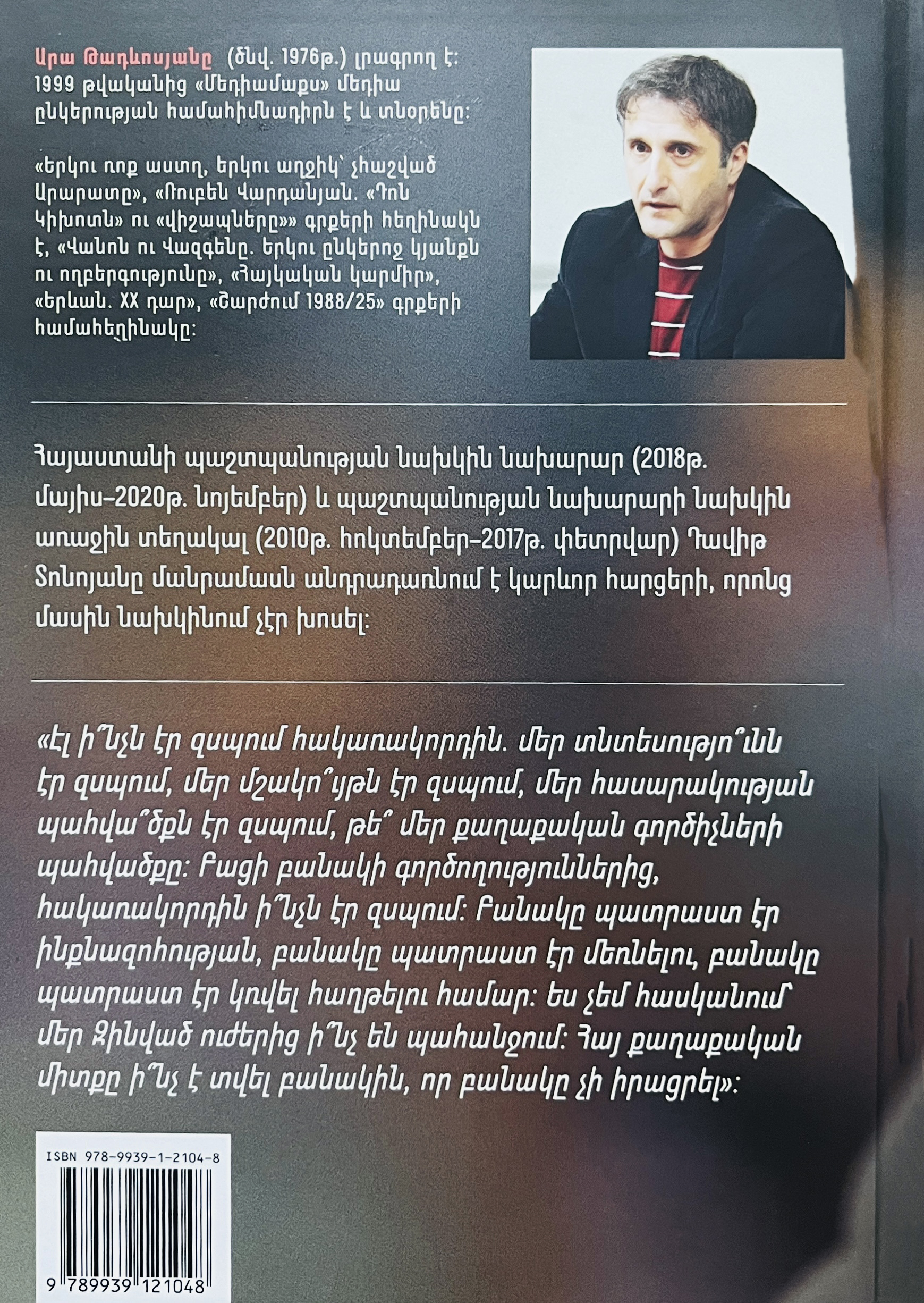 Հայաստանի պաշտպանության նախկին նախարար (2018թ. մայիս-2020թ. նոյեմբեր) և պաշտպանության նախարարի նախկին առաջին տեղակալ (2010թ. հոկտեմբեր-2017թ. փետրվար) Դավիթ Տոնոյանը մանրամասն անդրադառնում է կարևոր հարցերի, որոնց մասին նախկինում չէր խոսել: Դրանց թվում են զինվորականների և քաղաքական ղեկավարության հարաբերությունները տարբեր ժամանակաշրջաններում, զինված ուժերի դերակատարությունը Լեռնային Ղարաբաղի խնդրի խաղաղ կարգավորման գործընթացում, 2016թ. Ապրիլյան պատերազմը, 2018թ. իշխանափոխությունը, 2020 թվականի պատերազմը, 2021թ. սեպտեմբերից 2024թ. օգոստոս իր անազատության մեջ գտնվելը: Գրքի «Թղթապանակ» բաժնում ներկայացված բազմաթիվ փաստագրական նյութերն օգնում են ավելի լավ պատկերացում կազմել կարևոր իրադարձությունների և դրանց նախապատմության մասին։