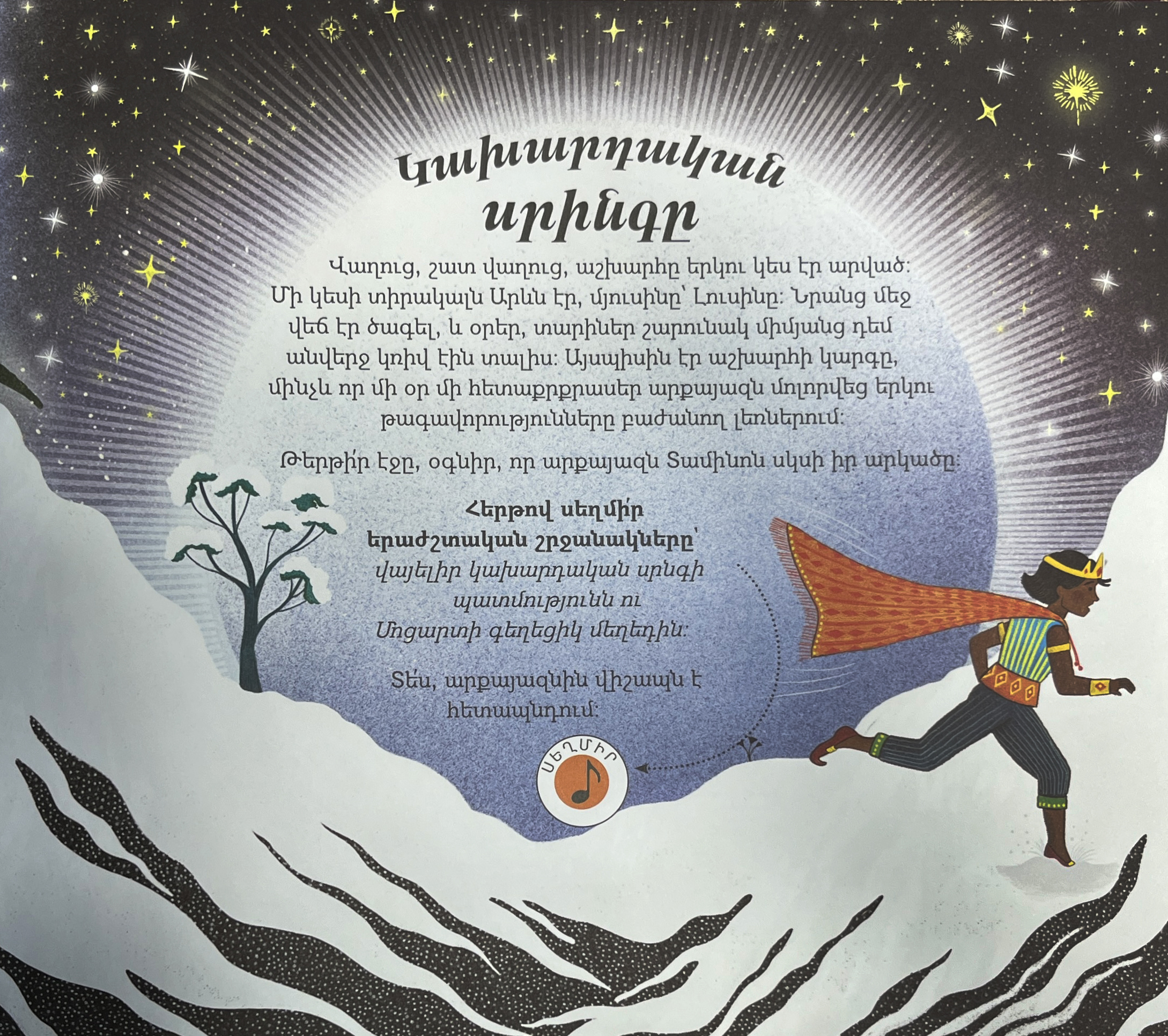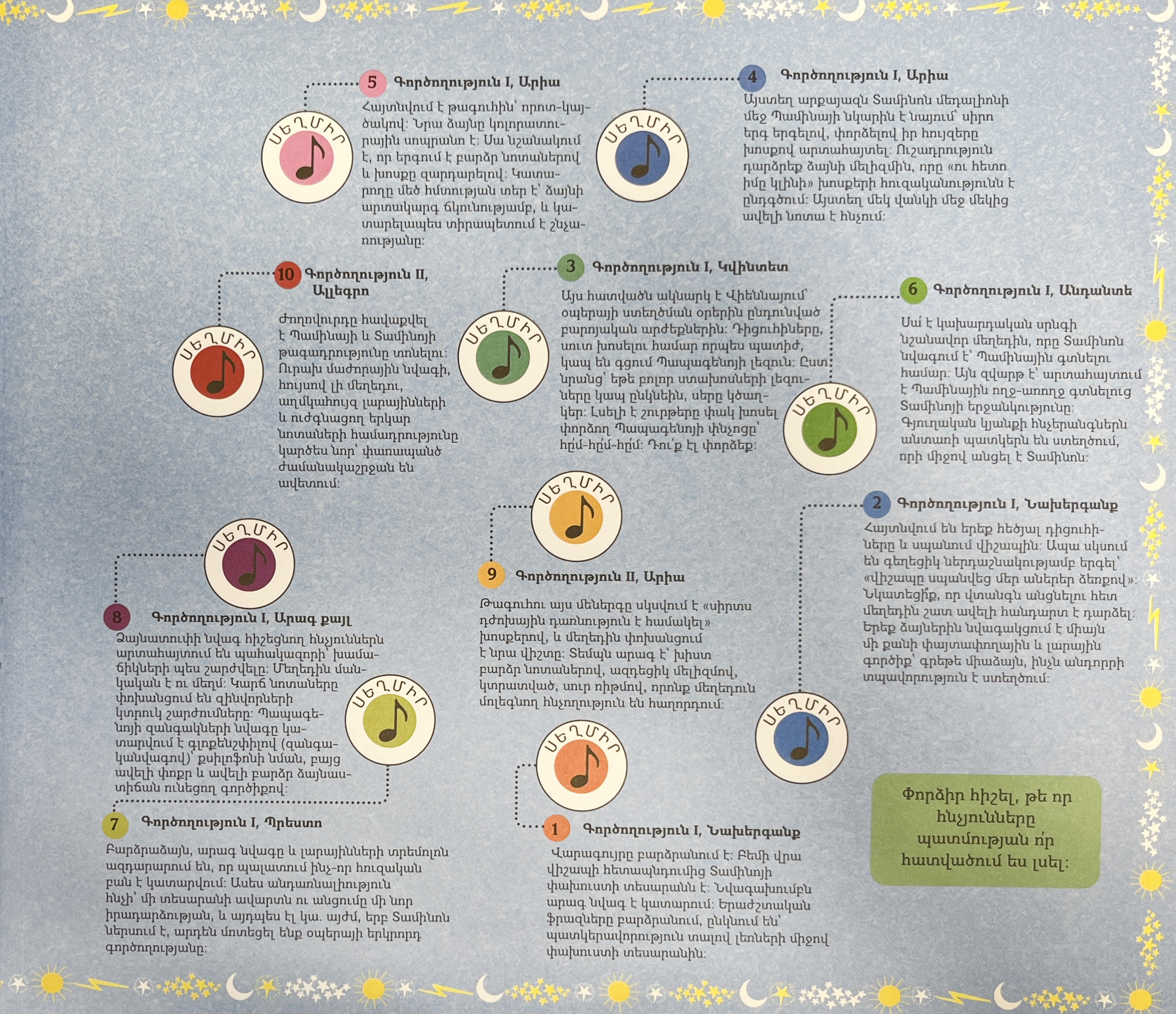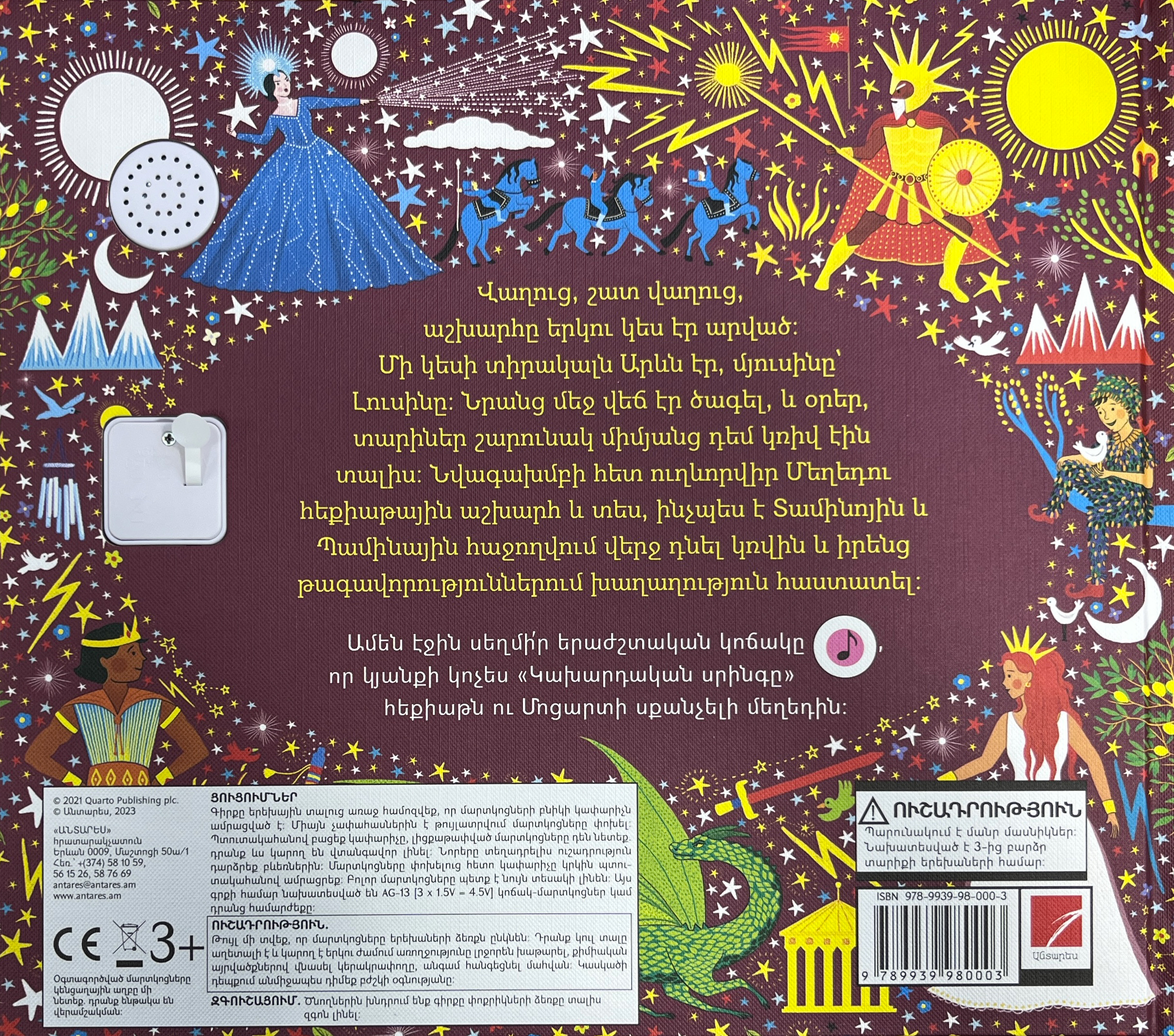 Վաղուց, շատ վաղուց, աշխարհը երկու կես էր արված: Մի կեսի տիրակալն Արևն էր, մյուսինը՝ Լուսինը: Նրանց մեջ վեճ էր ծագել, և օրեր, տարիներ շարունակ միմյանց դեմ կռիվ էին տալիս: Նվագախմբի հետ ուղևորվիր Մեղեդու հեքիաթային աշխարհ և տես, ինչպես է Տամինոյին և Պամինային հաջողվում վերջ դնել կռվին և իրենց թագավորություններում խաղաղություն հաստատել: Ամեն էջին սեղմի՛ր երաժշտական կոճակը, որ կյանքի կոչես <<Կախարդական սրինգը>> հեքիաթն ու Մոցարտի սքանչելի մեղեդին: