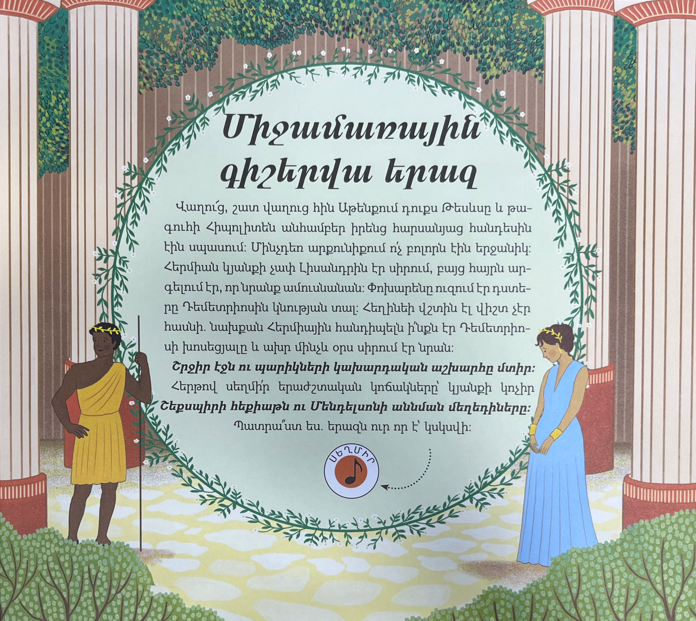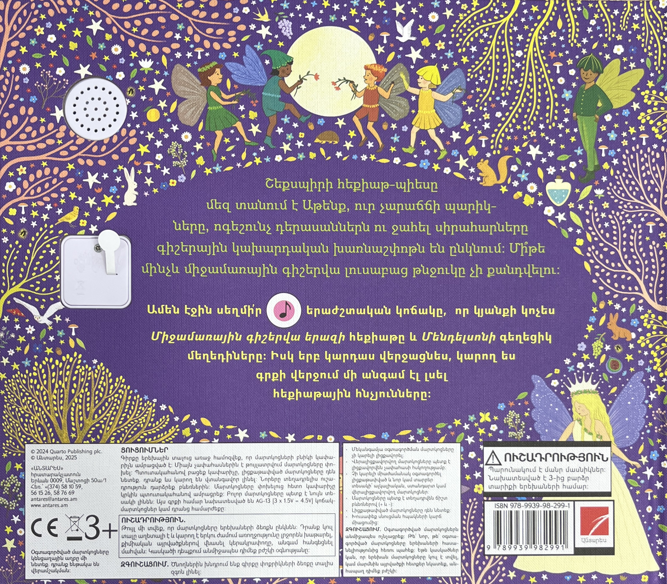 Շեքսպիրի հեքիաթ-պիեսը մեզ տանում է Աթենք, ուր չարաճճի պարիկները, ոգեշունչ դերասաններն ու ջահել սիրահարները գիշերային կախարդական խառնաշփոթն են ընկնում: Մի՞թե մինչև միջամառային գիշերվա լուսաբաց թնջուկը չի քանդվելու: Ամեն էջին սեղմիր երաժշտական կոճակը, որ կյանքի կոչես Միջամառային գիշերվա երազի հեքիաթը և Մենդելսոնի գեղեցիկ մեղեդիները: Իսկ երբ կարդաս վերջացնես, կարող ես գրքի գրքի վերջում մի անգամ էլ լսել հեքիաթային հնչյունները: