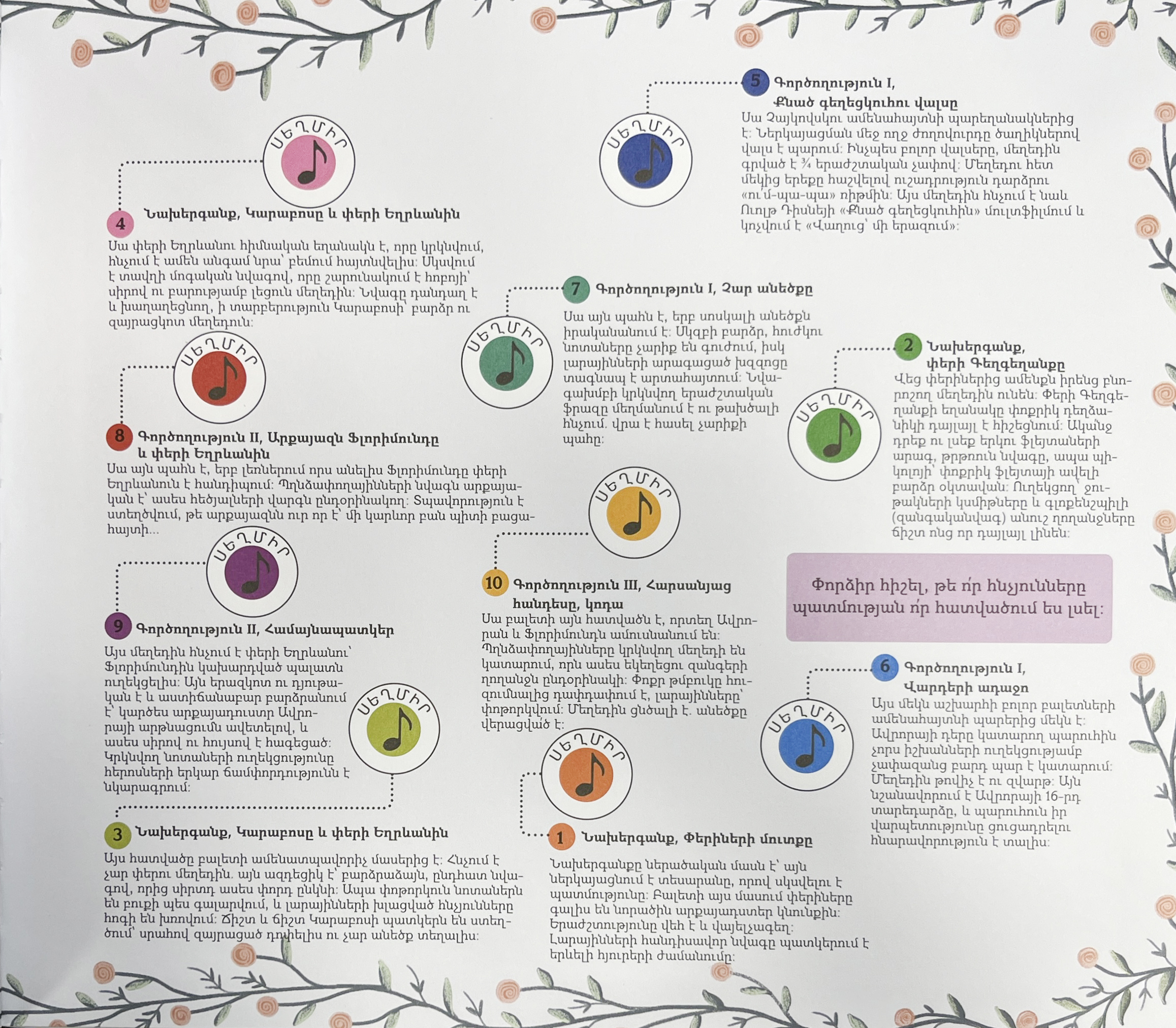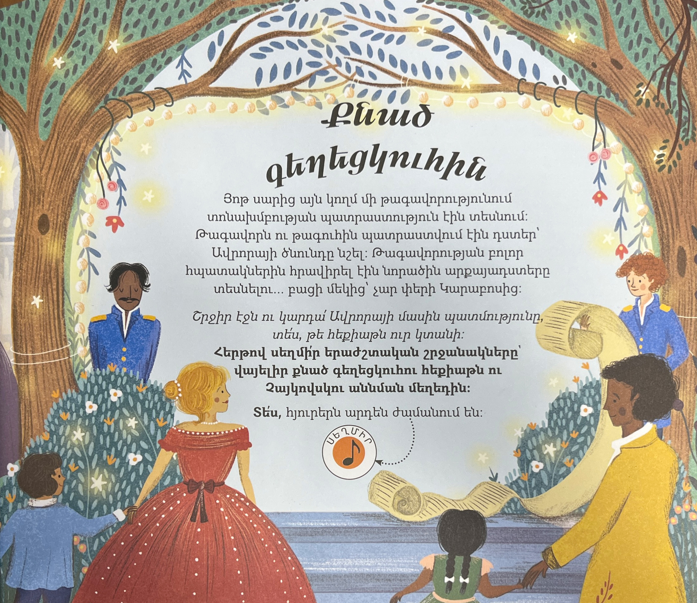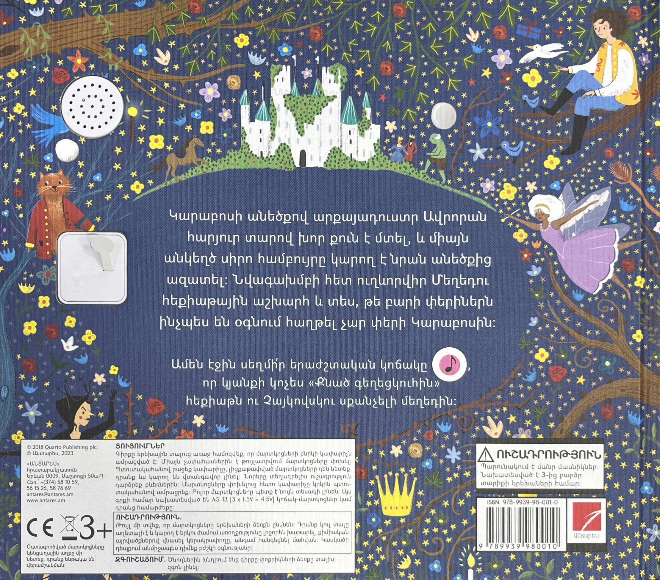 Կարաբոսի անեծքով արքայադուստր Ավրորան հարյուր տարով խոր քուն է մտել, և միայն անկեղծ սիրո համբույրը կարող է նրան անեծքից ազատել: Նվագախմբի հետ ուղևորվիր Մեղեդու հեքիաթային աշխարհ և տես, թե բարի փերիներն ինչպես են օգնում հաղթել չար փերի Կարաբոսին: Ամեն էջին սեղմի՛ր երաժշտական կոճակը որ կյանքի կոչես <<Քնած գեղեցկուհին>> հեքիաթն ու Չայկովսկու սքանչելի մեղեդին: