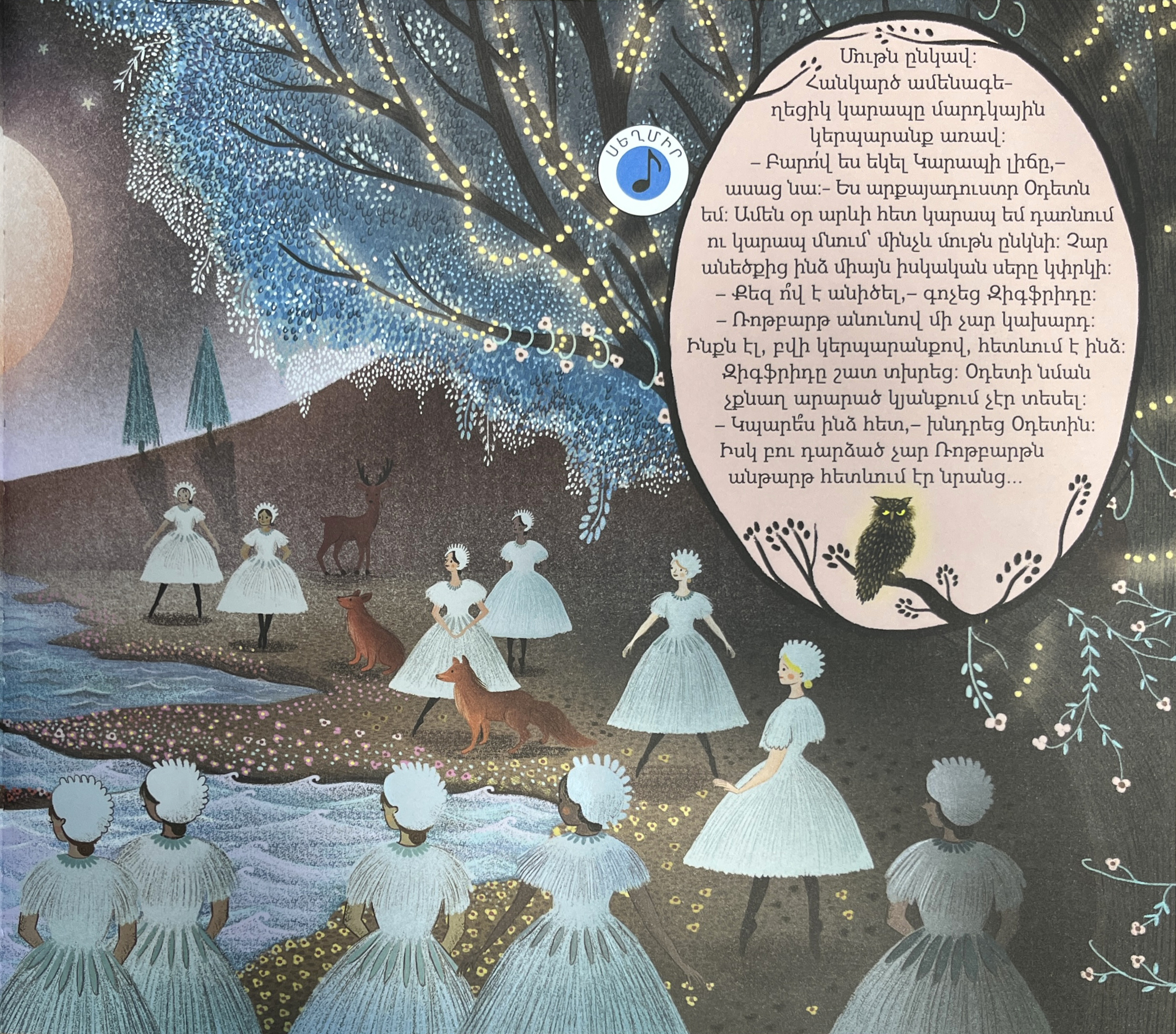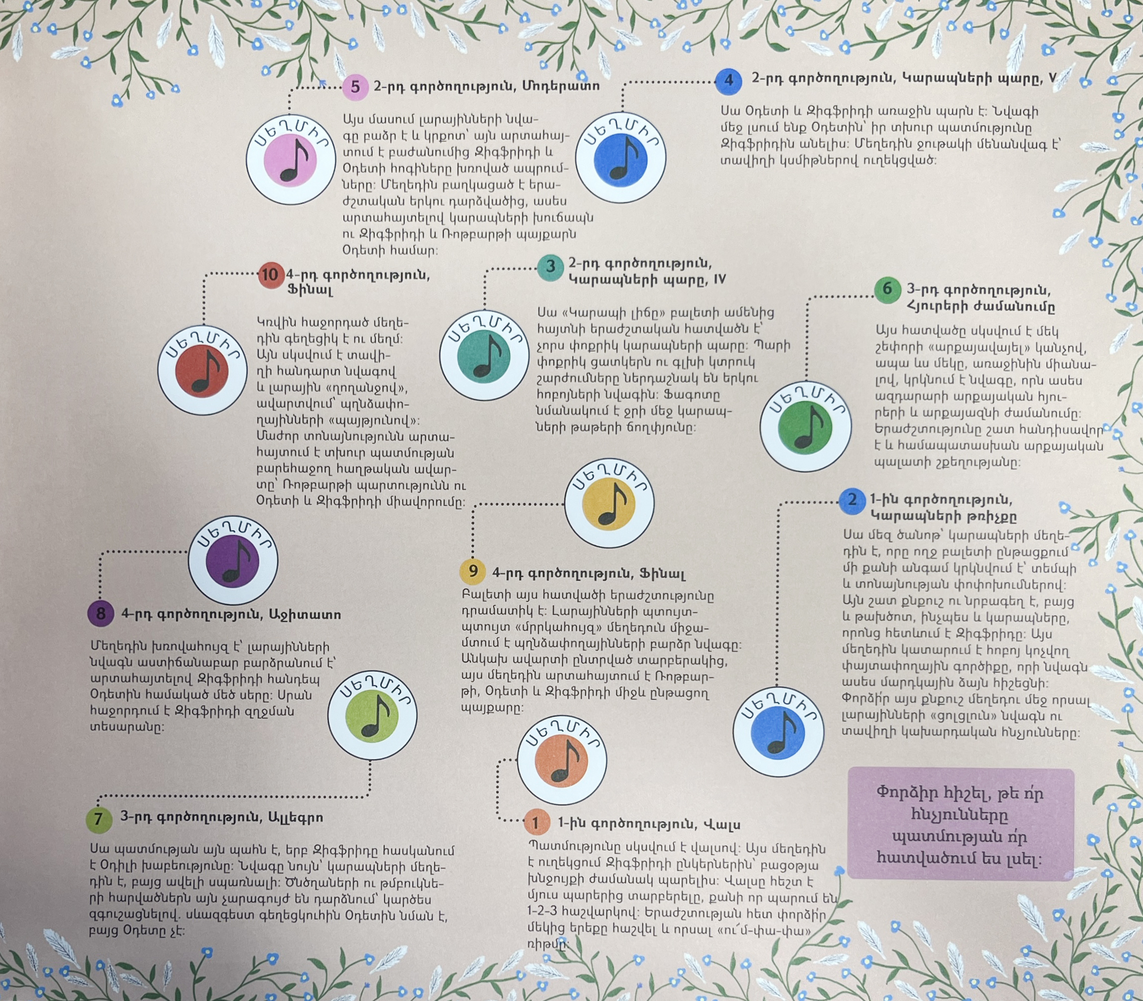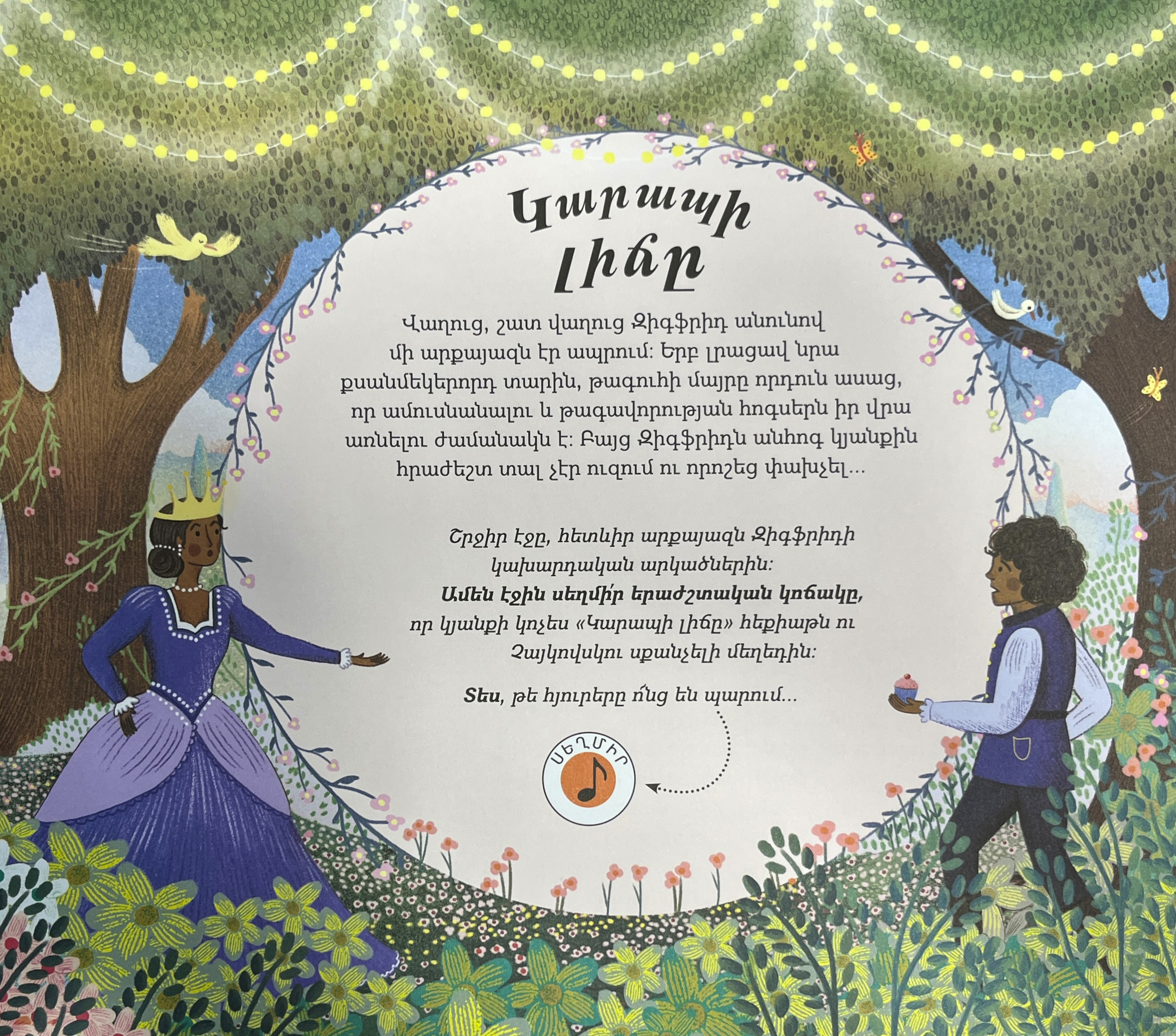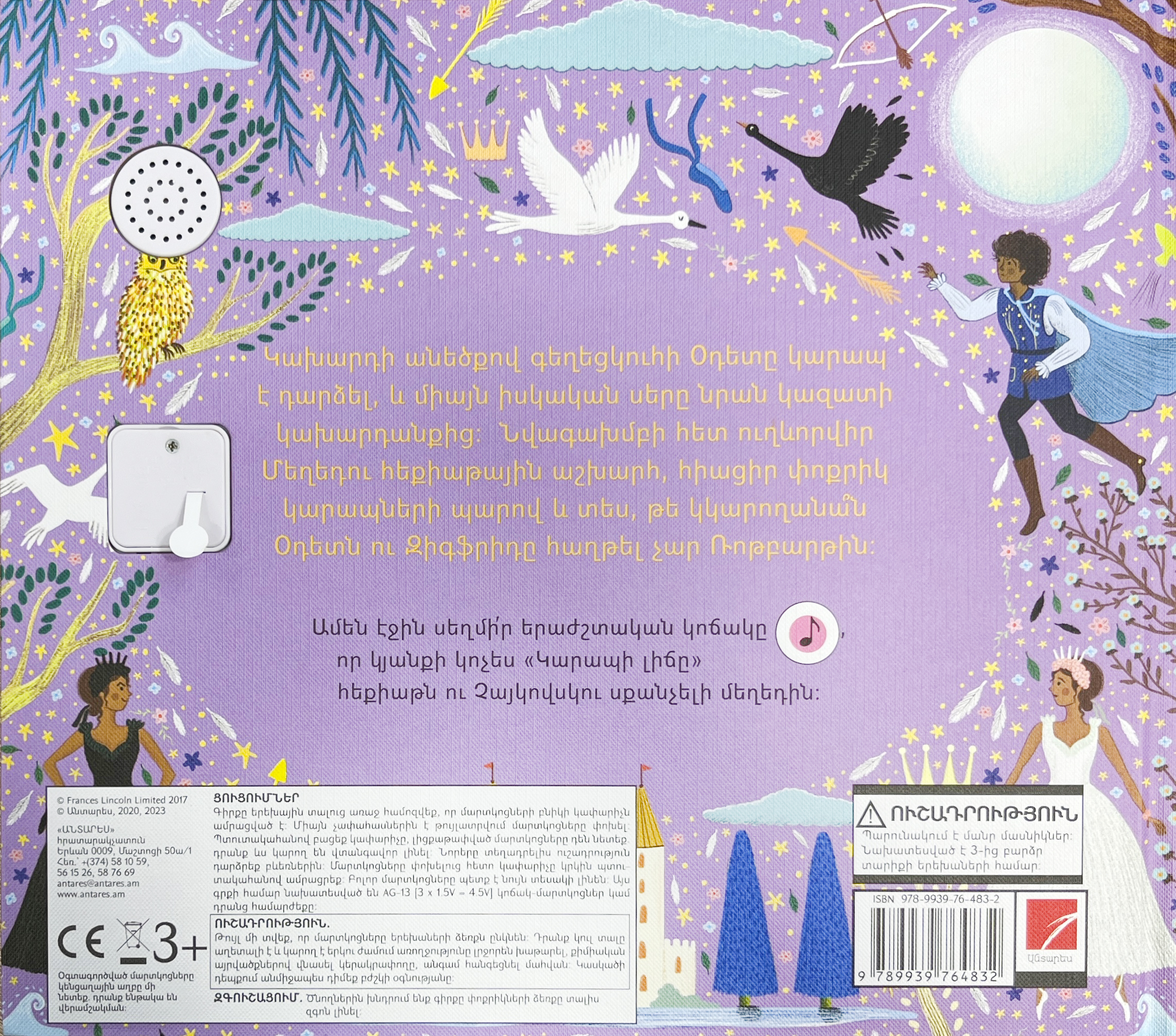 Կախարդանքի անեծքով գեղեցկուհի Օդետը կարապ է դարձել, և միայն իսկական սերը նրան կազատի կախարդանքից: Նվագախմբի հետ ուղևորվիր Մեղեդու հեքիաթային աշխարհ, հիացիր փոքրիկ կարապների պարով և տես, թե կկարողանա՞ն Օդետն ու Զիգֆրիդը հաղթել չար Ռոթբարթին: Ամեն էջին սեղմի՛ր երաժշտական կոճակը, որ կյանքի կոչես <<Կարապի լիճը>> հեքիաթն ու Չայկովսկու սքանչելի մեղեդին: