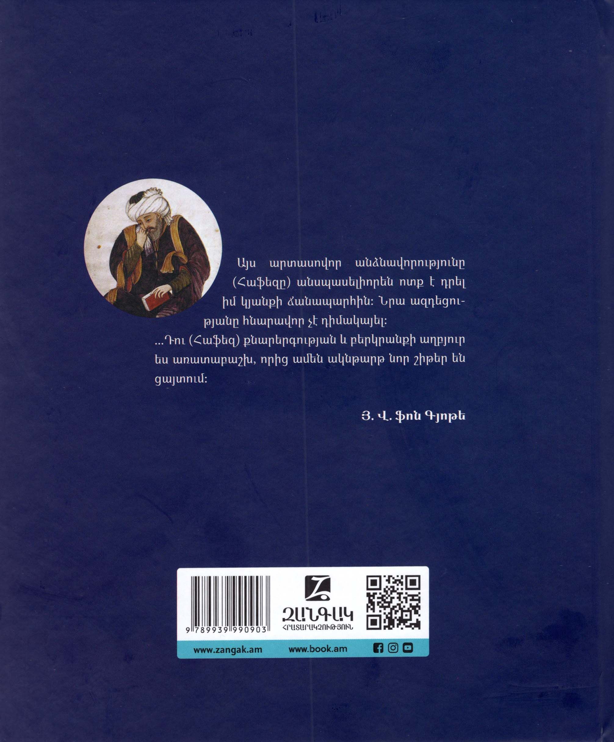 Խոջա Շամսեդդին Մոհամմադ Շիրազին՝ առավել հայտնի Հաֆեզ մականունով, պարսկական քնարերգության մեծագույն վարպետներից է։ XIV դարի պոետի ստեղծագործությունը զգալի ազդեցություն է թողել ողջ պարսկական մշակույթի վրա և շարունակում է մնալ ամենասիրվածներից և ընթերցվողներից ցայսօր։ Սույն ժողովածուն ներառում է բանաստեղծի 292 գազել և 16 քառյակ։ Նախատեսված է ընթերցողների լայն շրջանակի համար։