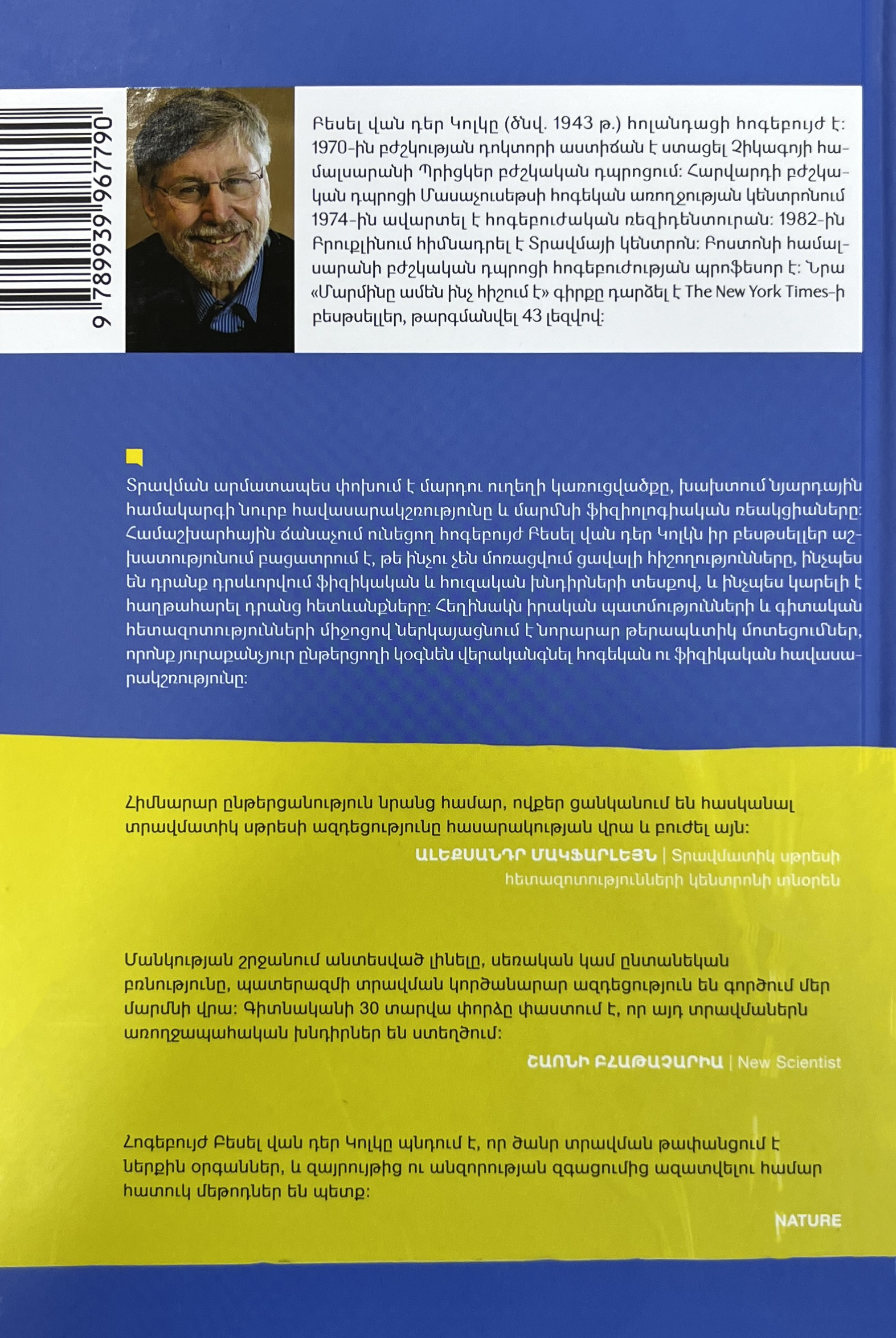 Տրավման արմատապես փոխում է մարդու ուղեղի կառուցվածքը, խախտում նյարդային համակարգի նուրբ հավասարակշռությունը և մարմնի ֆիզիոլոգիական ռեակցիաները։ Համաշխարհային ճանաչում ունեցող հոգեբույժ Բեսելվան դեր Կոլկն իր բեսթսելլեր աշխատությունում բացատրում է, թե ինչու չեն մոռացվում ցավալի հիշողությունները, ինչպես են դրանք դրսևորվում ֆիզիկական և հուզական խնդիրների տեսքով, և ինչպես կարելի է հաղթահարել դրանց հետևանքները։...