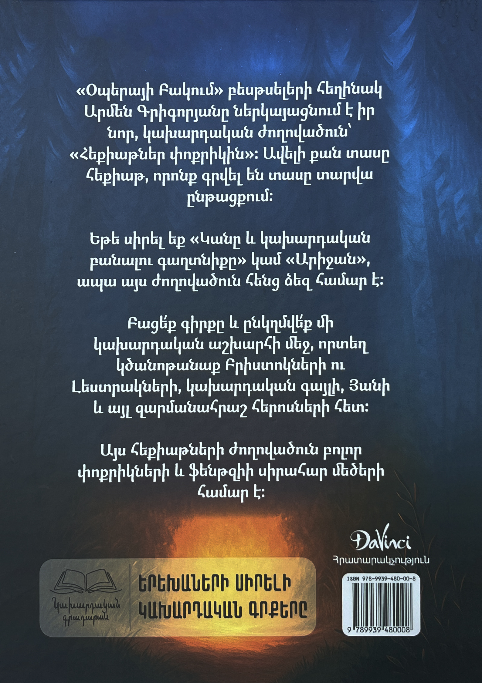 «Օպերայի բակում» բեսթսելերի հեղինակ Արմեն Գրիգորյանը ներկայացնում էիր նոր, կախարդական ժողովածուն՝ «Հեքիաթներ փոքրիկին»։ Բացե՛ք գիրքը և ընկղմվե՛ք մի կախարդական աշխարհի մեջ, որտեղ կծանոթանաք Բրիստոկների ու Լեստրակների, կախարդական գայլի, Յանի և այլ զարմանահրաշ հերոսների հետ։ Այս հեքիաթների ժողովածուն բոլոր փոքրիկների և ֆենթզիի սիրահար մեծերի համար է։