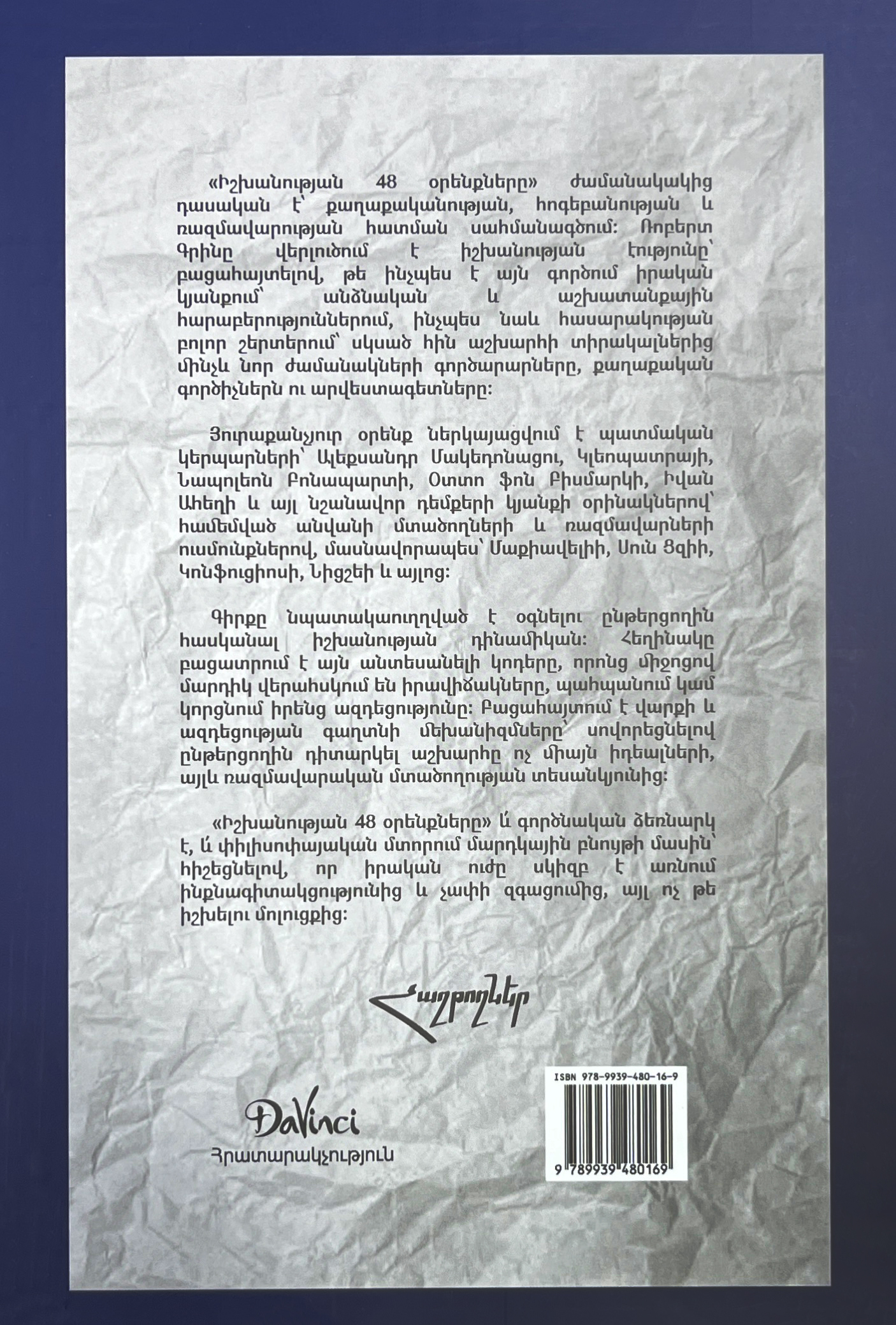 «Իշխանության 48 օրենքները» ժամանակակից դասական է՝ քաղաքականության, հոգեբանության և ռազմավարության հատման սահմանագծում: Ռոբերտ Գրինը վերլուծում է իշխանության էությունը՝ բացահայտելով, թե ինչպես է այն գործում իրական կյանքում՝ անձնական և աշխատանքային հարաբերություններում, ինչպես նաև հասարակության բոլոր շերտերում՝ հին աշխարհի տիրակալներից մինչև նոր ժամանակների գործարարներ, քաղաքական գործիչներ ու արվեստագետներ: Յուրաքանչյուր օրենք ներկայացվում է...