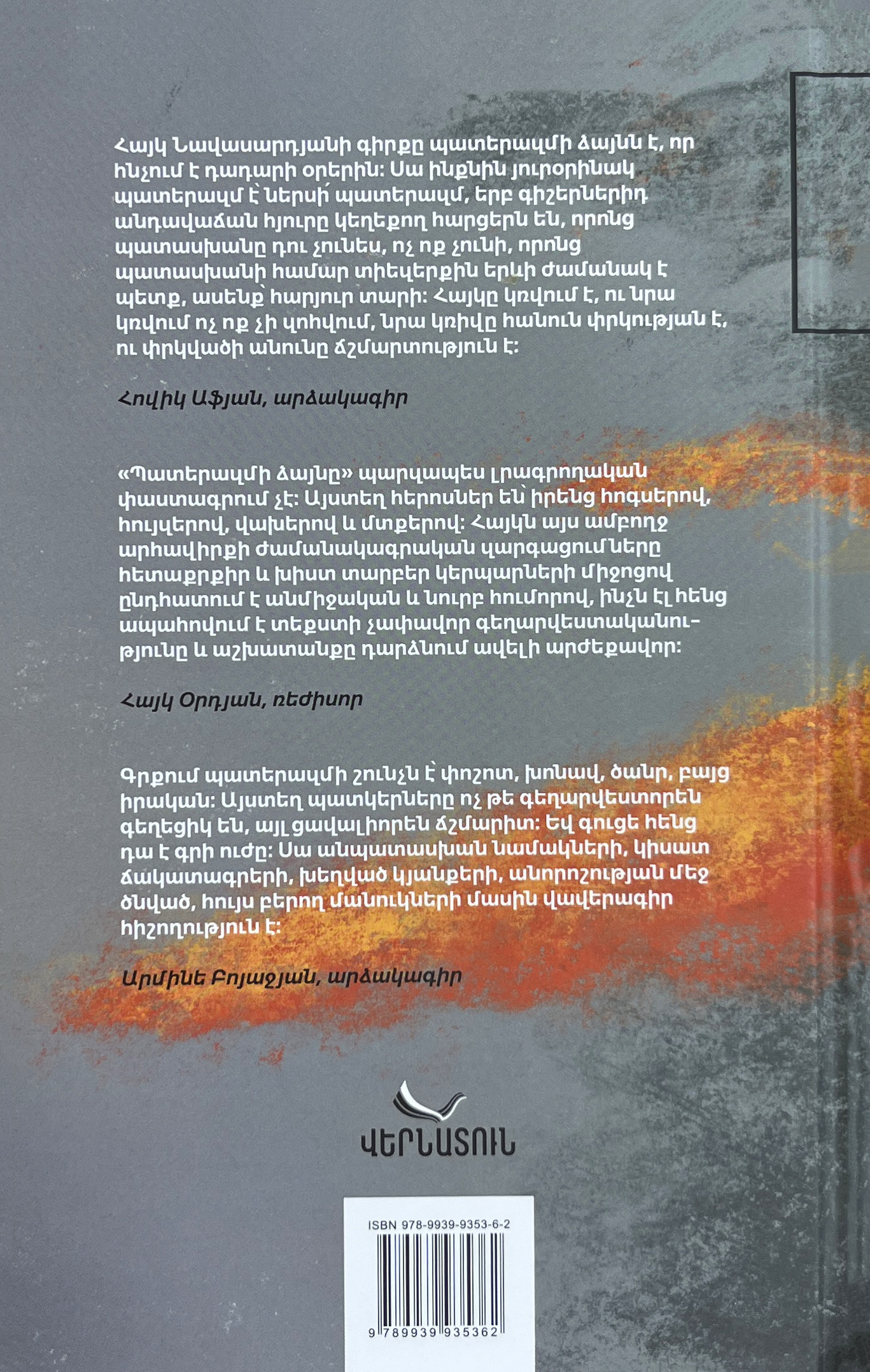 Հայկ Նավասարդյանի <<Պատերազմի ձայնը>> հուշագրությունը քառասունչորսօրյա պատերազմի վավերագրությունն է: Տեքստում պատերազմի օրերը ներկայացվում են ոչ միայն որպես պատմական փաստ, այլև որպես ապրում, տեսածի, լսածի, զգացածի վկայություն: Հեղինակը, լինելով լրագրող, պատերազմի օրերին աշխատել է Արցախում՝ հայտնվելով ռազմաճակատի տարբեր հատվածներում: Նրա աչքով, տեսախցիկով և խոսքով է ընթերցողը հայտնվում առաջնագծում և թիկունքում՝ այնտեղ,...