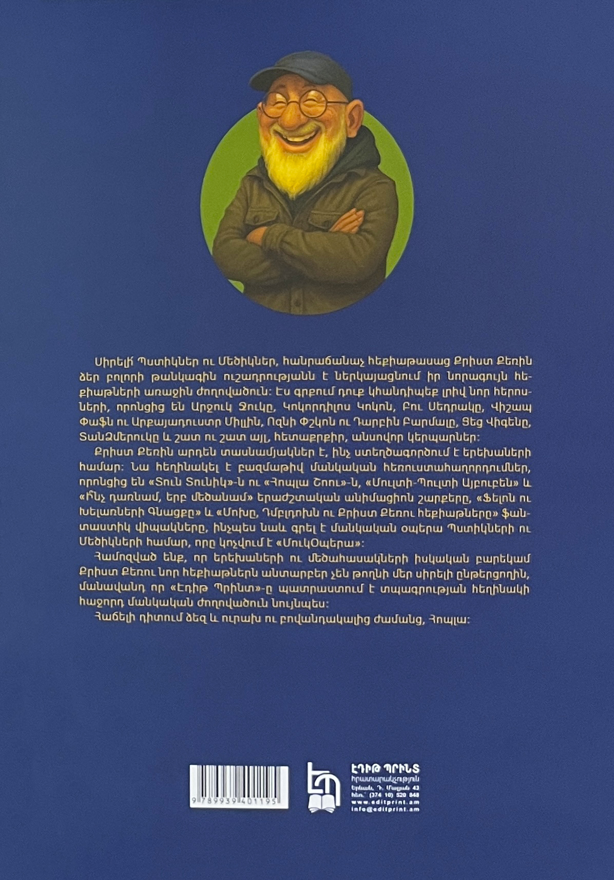 Սիրելի՛ Պստիկներ ու Մեծիկներ, հանրաճանաչ հեքիաթասաց Քրիստ Քեռին ձեր բոլորի թանկագին ուշադրությանն է ներկայացնում իր նորագույն հեքիաթների առաջին ժողովածուն: Էս գրքում դուք կհանդիպեք լրիվ նոր հերոսների, որոնցից են՝ Արջուկ Ջուկը, Կոկորդիլոս Կոկոն, Բու Սեդրակը, Վիշապ Փաֆն ու Արքայադուստր Միլլին, Ոզնի Փշկոն ու Դարբին Բարմալը, Ցեց Վիգենը, ՏանՁմերուկը և շատ ու շատ այլ, հետաքրքիր, անսովոր կերպարներ: Քրիստ Քեռին արդեն տասնամյակներ է, ինչ ստեղծագործում է երեխաների համար: Նա հեղինակել է բազմաթիվ մանկական հեռուստահաղորդումներ, որոնցից են՝ «Տուն Տունիկ»-ն ու «Հոպլա Շոու»-ն, «Մուլտի-Պուլտի Այբուբեն» և «Ի՞նչ դառնամ, երբ մեծանամ» երաժշտական անիմացիոն շարքերը, «Ֆելոն ու Խելառների Գնացքը» «Մոխը, Դմբլդոխն ու Քրիստ Քեռու հեքիաթները» ֆանտաստիկ վիպակերը, ինչպես նաև գրել է մանկական օպերա Պստիկների ու Մեծիկների համար, որը կոչվում է «ՄուկՕպերա»: Համոզված ենք, որ երեխաների ու մեծահասակների իսկական բարեկամ Քրիստ Քեռու նոր հեքիաթներն անտարբեր չեն թողնի մեր սիրելի ընթերցողին, մանավանդ որ «Էդիթ Պրինտը» պատրաստում է տպագրության հեղինակի հաջորդ մանկական ժողովածուն նույնպես: Հաճելի դիտում ձեզ և ուրախ ու բովանդակալից ժամանց, Հոպլա: