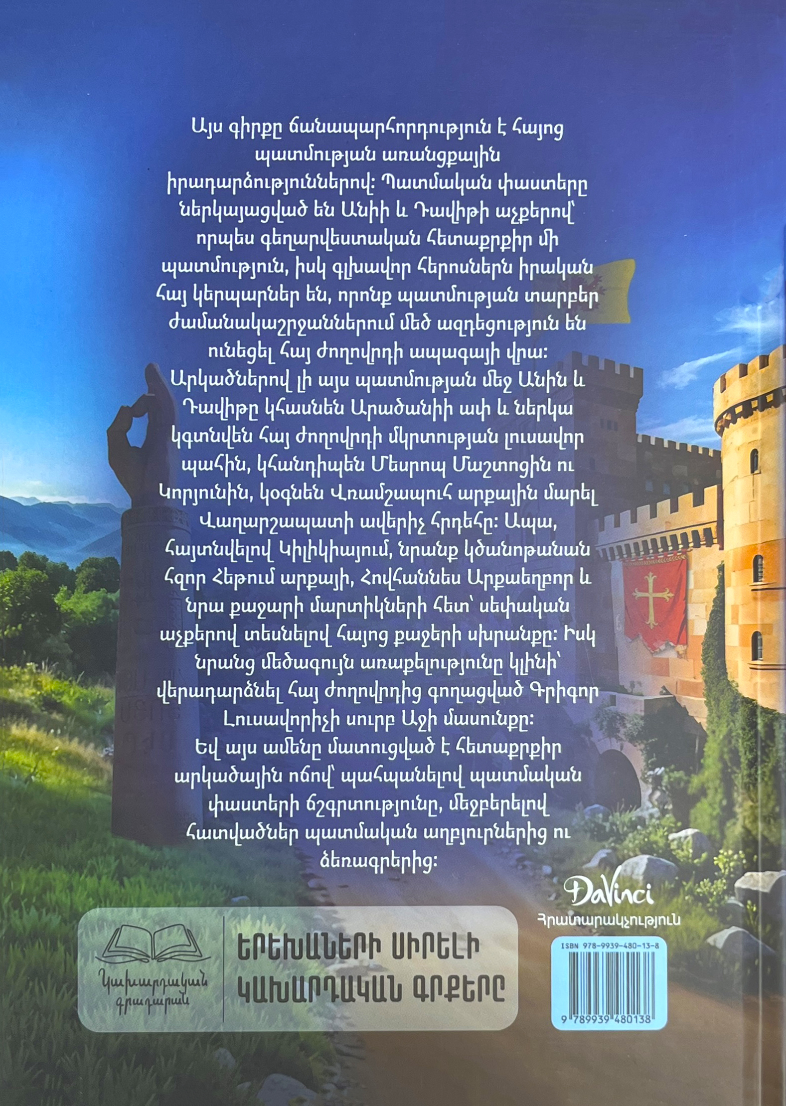 Այս գիրքը ճանապարհորդություն է Հայոց պատմության առանցքային իրադարձություններով: Պատմական փաստերը ներկայացված են Անիի և Դավիթի աչքերով՝ որպես գեղարվեստական հետաքրքիր մի պատմություն, իսկ գլխավոր հերոսներն իրական հայ կերպարներ են, որոնք պատմության տարբեր ժամանակաշրջաններում մեծ ազդեցություն են ունեցել հայ ժողովրդի ապագայի վրա: Արկածներով լի այս պատմության մեջ Անին և Դավիթը կհասնեն Արածանիի ափ և ներկա կգտնվեն հայ ժողովրդի մկրտության լուսավոր պահին, կհանդիպեն Մեսրոպ Մաշտոցին ու Կորյունին, կօգնեն Վռամշապուհ արքային մարել Վաղարշապատի ավերիչ հրդեհը: Ապա, հայտնվելով Կիլիկիայում, նրանք կծանոթանան հզոր Հեթում արքայի, Հովհաննես Արքաեղբոր և նրա քաջարի մարտիկների հետ՝ սեփական աչքերով տեսնելով հայոց քաջերի սխրանքը: Իսկ նրանց մեծագույն առաքելությունը կլինի՝ վերադարձնել հայ ժողովրդից գողացված Գրիգոր Լուսավորիչի սուրբ Աջի մասունքը: Եվ այս ամենը մատուցված է հետաքրքիր արկածային ոճով՝ պահպանելով պատմական փաստերի ճշգրտությունը, մեջբերելով հատվածներ պատմական աղբյուրներից ու ձեռագրերից:
